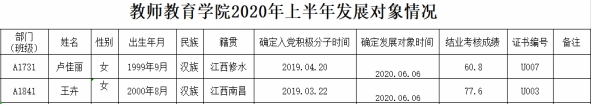 经过入党积极分子考察期考察,现将卢佳丽、王卉两位同学转为发展对象。为了广泛听取群众意见,接受群众监督,现予以公示,公示时间为7天(2020年6月1日至7日)。具体情况如下: