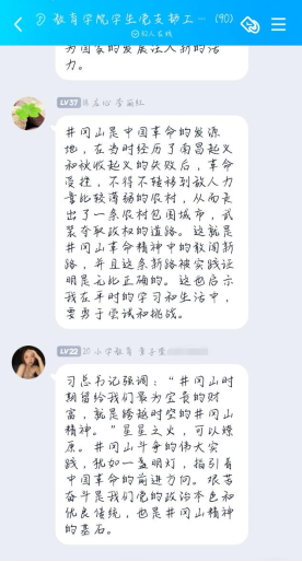 学习讨论由支部组织委员王卉同学在线上发起,学习主题是“如何让井冈山精神放射出新的时代光芒”。会议共计89位员工党员、预备党员、发展对象及入党积极分子同志参与了线上讨论,其中预备党员孙崇元同学认为井冈山精神是共产党人在井冈山根据地形成的伟大革命精神,在当时是引导中国革命走向胜利的宝贵财富。在新时代下,我们仍要继续弘扬井冈山精神,坚定理想信念,在新时代做好新任务。
