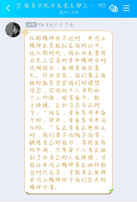 预备党员罗倩同学将井冈山精神与青春本色结合,认为在迈入新时代的过程中,更应该将历史上宝贵的革命精神与时代相结合,发挥其现实意义。作为员工,我们最应该做的就是坚定我们的理想信念,实现好个人目标和个人价值,艰苦奋斗、敢于拼搏。正如习近平总书记所言:“现在,青春是用来奋斗的;将来,青春是用来回忆的。”在正青春正热血之时,我们要不怕输不怕苦,锻炼自己的能力,苦练生存的本领,只有每个人真正做到了为自己的人生拼搏,才能让井冈山精神真正地折射出时代光芒,才能真正发挥井冈山精神给予我们巨大的精神力量。