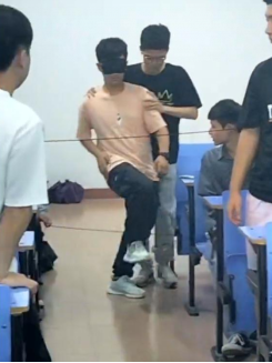第四环节:“信任之旅”,即使蒙住眼睛看不见,但在同伴的帮助下成功跨过了障碍,助人与受助、相互信任是如此的温馨。