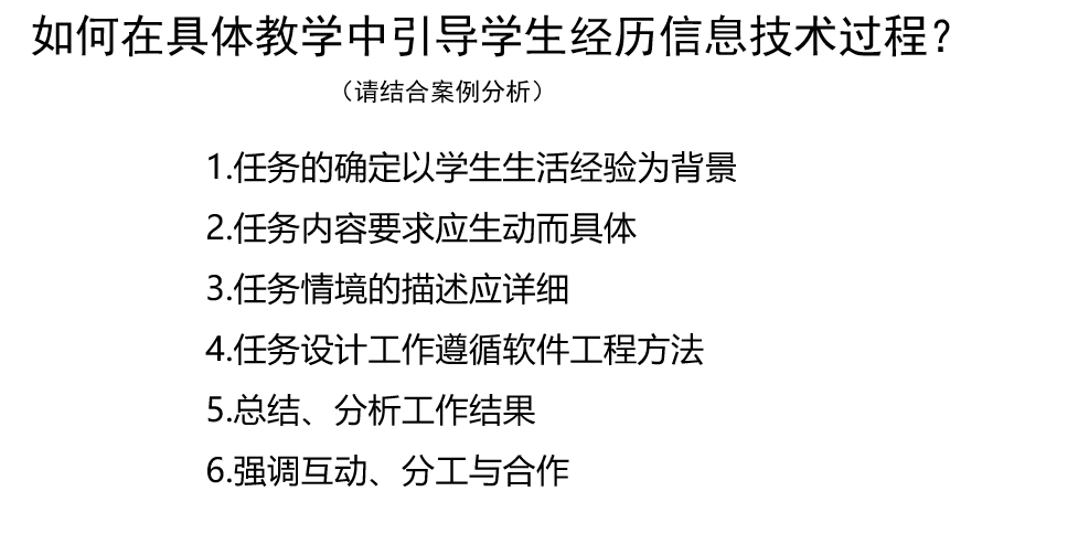 理解信息技术课程教学的原则,明确教学原则与教学实施过程的融入方式 |