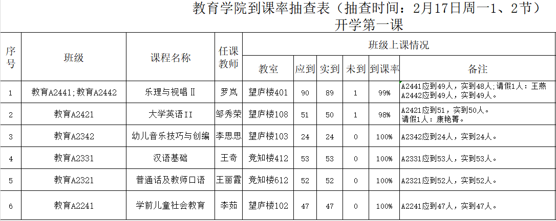此次涉及的检查班级共计7个,教学秩序良好,教师备课充分,教学设备运行正常,教室卫生干净整洁。教师全部提前到岗,师生精神面貌积极向上。除个别员工请假,员工出勤率高,课堂参与积极。开学第一课总体情况良好,教学工作有序开展。