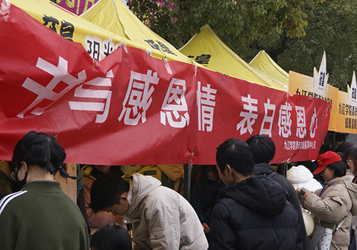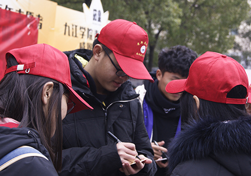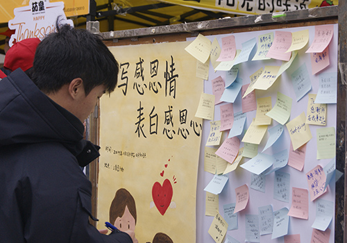 志愿者们还专门准备了几面“感恩墙”还有“感恩树”,将同学们写下的话语张贴在其上。一面面墙,一颗颗树,写满了各色各样的话语,但是无一例外,同学们都用着一颗温暖的心书写下这些文字,在这寒日里,广场上的人,用着自己的心意温暖着整座校园。