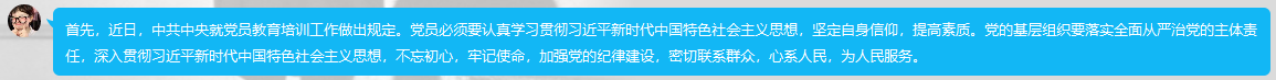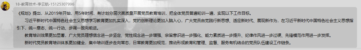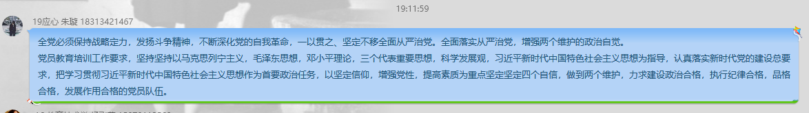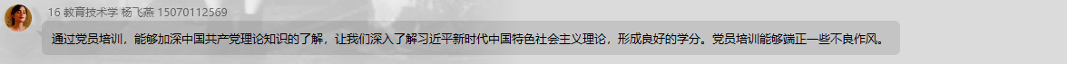 通过本次学习讨论,同学们学习了中共中央对党员教育培训工作的总体要求、习近平新时代中国特色社会主义思想教育培训、培训的主要内容、方法以及开展的组织领导和基础保障。党员的基础教育培训很重要,党员内部的管理一样重要,落实全面从严治党的主体责任刻不容缓,没有一个纪律严明的党干部团体,国家的发展就会停滞不前。