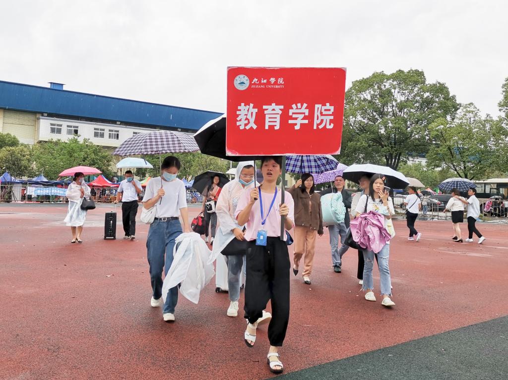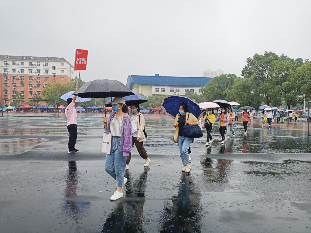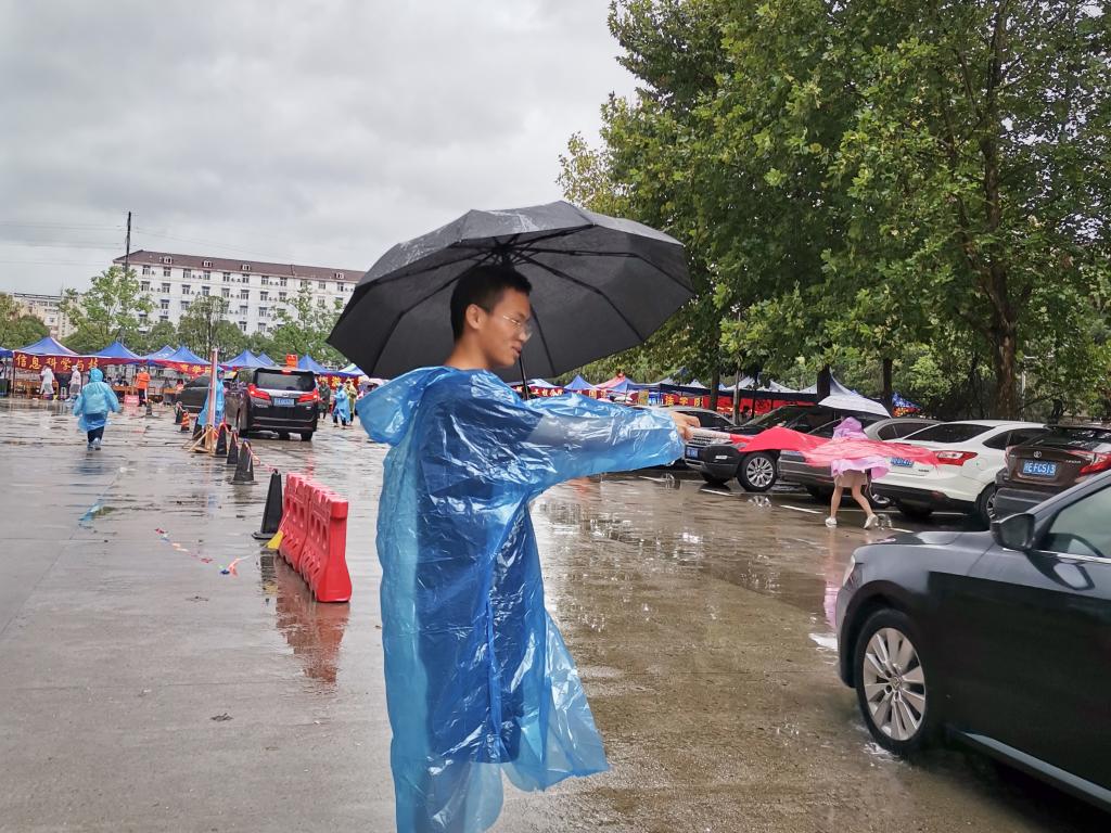 田径馆外,虽然有大雨倾盆,我们的志愿者们仍伫立在雨中,维护着现场秩序,为新生及家长指引道路。