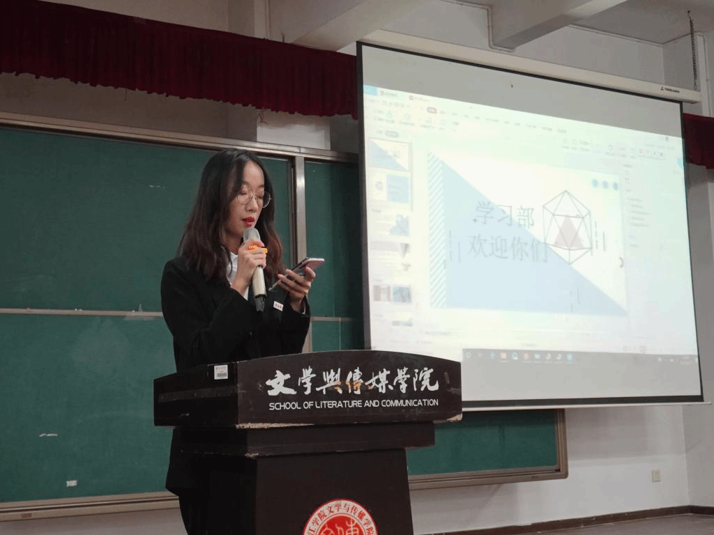 紧接着张子一向新生详细介绍了院员工会基本工作内容,招新活动正式开始。员工会各部门代表依次上场进行发言,他们通过PPT讲解、视频播放等多样方式向同学们呈现了各部门的工作内容与特色,加深了同学们对员工会各部门的了解。PPT中也不乏充满趣味的表情包,贴近了与同学们的距离。工作介绍环节结束后,各部门招新负责人有序退场,在面试教室等待同学们的应聘。