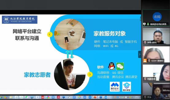 2月2日晚19:30,bevictor伟德在线家教志愿服务项目启动仪式通过腾讯会议在线举行。省委宣传部文明一处处长、驻玉京村扶贫工作队队长、第一书记赖政兵、九江三中副董事长、驻庐山市蛟塘镇芙蓉村第一书记李然、江西省吉安市青原区文陂镇大贤村支部书记黄清华、伟德bevictor中文版公司党委副书记吴燕、志愿服务活动指导教师、教工党支部书记朱青博士、实验实训中心主任蒋枫霆、院团委肖静老师及本次活动全体志愿者参加了启动仪式。仪式由学前教育专业A2041班的贾甜欣同学主持。
