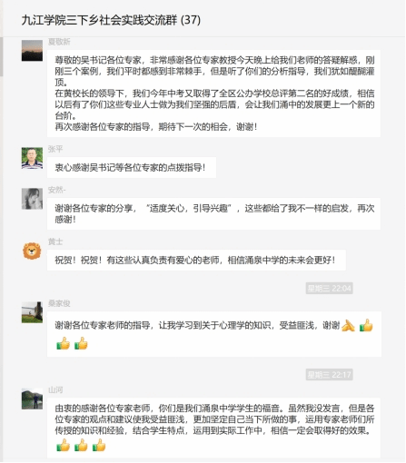 面对乡村中学心理专业团队不足的难题,为了切实帮扶中学教师提升员工心理辅导知识与能力,7月7日晚,以公司党委副书记吴燕为首的志愿服务队心理学教师团队邀请涌泉中学全体教师,开展中员工心理健康案例在线沙龙辅导活动。交流中,服务队四位教师针对涌中老师日常员工管理中遇到的数例典型心理辅导个案进行了分析与指导,为涌中老师的心育工作提供了科学有效、“接地气儿”的心理辅导方法,受到了该校领导及全体教师的热烈欢迎和点赞。