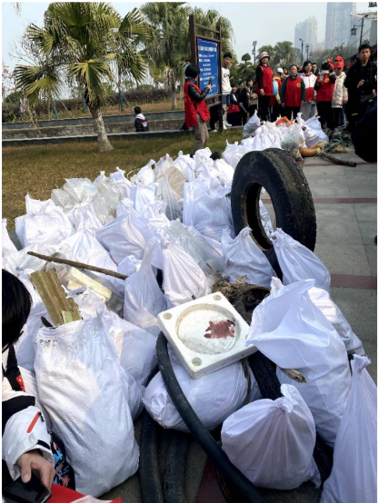 活动过程中,志愿者们从水源保护区最远处往回捡拾垃圾,并且谨记学姐分享的技巧:从下往上捡拾水源保护区失控滞留的滩涂垃圾,可以更好地保护自身安全从而避免滑落。他们一边捡拾白色垃圾,一边相互分享垃圾分类的知识,为这次活动增添了不少乐趣,遇到深埋在沙滩里的垃圾,志愿者们不怕脏不怕累,丝毫没有放弃的意思。随着环保垃圾袋的装满,志愿活动接近尾声。