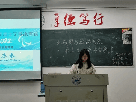 本次团日由团支书吴楚棋主持,首先吴楚棋给同学们播放了与冬残奥运动员相关的视频,让同学们直观感受到了奥运会运动员自尊、自信、自强、自立的体育精神,让全体同学深刻体会到了冬残奥理念和志愿者精神。冬残奥运会秉承“精神寓于运动”和“团结、友谊、平等”的理念燃起残疾运动员们的激情,也唤起了人们对残疾人更多的理解、尊重与关爱。推动残疾人事业的进步与发展,也象征着人类文明的进步。同时也让我们看到了志愿者们默默奉献的身影,他们秉承着“奉献、友爱、互助、进步”的志愿者精神,为残奥会的顺利开展贡献着属于自己的一份力量。
