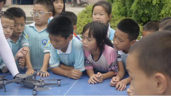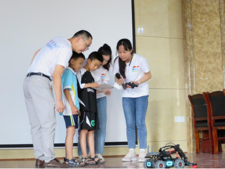 接下来进行的是演示体验环节,团队成员带领同学们体验了机甲战士、跳舞机器人、无人机设备。在老师与队员的讲解与指导下,官莲乡中心小学的员工们自己动手尝试操作使机器人成功运作。