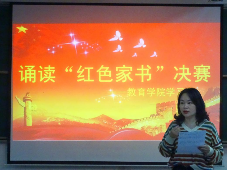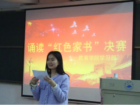 经由前期班级初赛,最终共有7名选手进入决赛。学习部主持人邬晶雯宣布比赛正式开始。首先1号选手龚晨曦同学诵读的是林觉民的《与妻书》,使大家体会到了林觉民对妻子的深情和对处于水深火热中的祖国深沉的爱,再现了中华儿女的英雄气概和共产党员的高贵品质。7号选手易梦露朗诵的是《海棠花祭》,她时而低沉婉转,时而慷慨激昂,深深感染着在场每一位观众,使同学们体会到了邓颖超同志对周总理无限的思念和无产阶级革命者灵魂结盟的忠贞理想和信念。