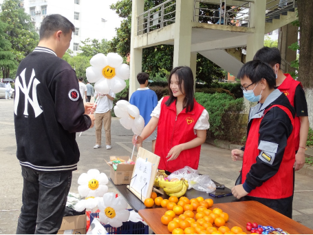 为了激发同学们参与活动的积极性,志愿者们特地设置了兑换小礼品区域,有水果、糖果、气球等。活动开始前,志愿者们统一着装提前十分钟在三食堂广场集合,提前分配好任务。一部分小组成员给同学们分发兑换券,另一部分小组成员负责兑换奖品,活动有条不紊的进行着。