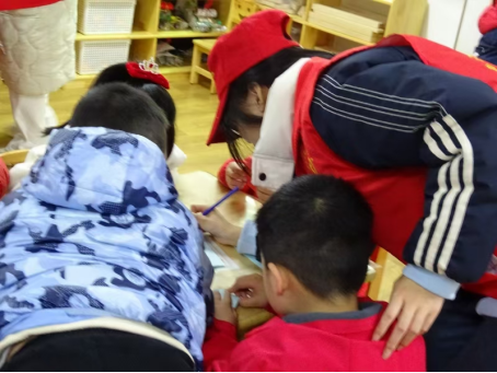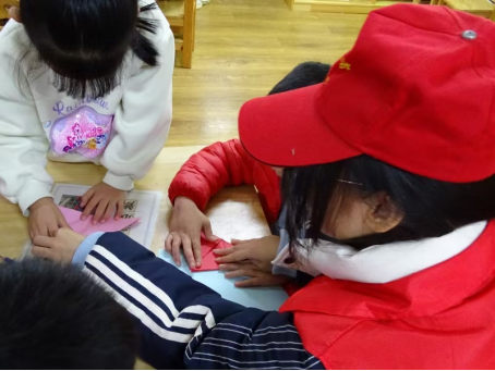 折纸教学环节中,志愿者们始终满怀耐心,一对一示范引导幼儿进行模仿创作,在小朋友求助时迅速给予帮助。志愿教学活动中,志愿者们注重小朋友们的相互交流与协助,鼓励他们要互相帮助。