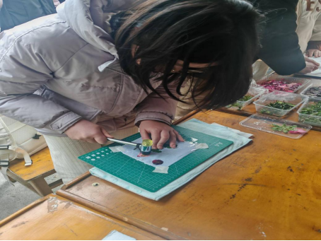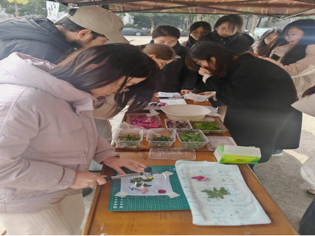 活动进程中,志愿者们以耐心细致的态度,手把手引领同学们步入植物拓染的奇妙世界,从植物的精心固定到敲拓力道的精准拿捏,每一步都倾注了他们对传统技艺的尊重与传承之心,让每一位参与者都能在动手实践中深刻体会到中华文化的博大精深与自然之美的和谐共生。