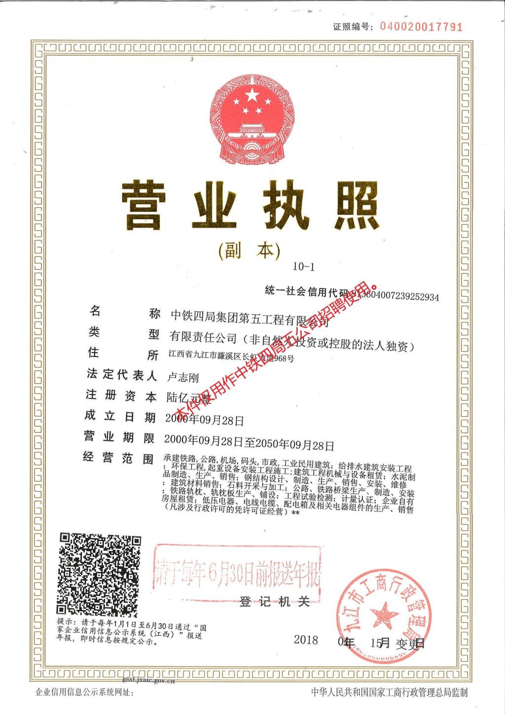 中铁四局集团第五工程有限公司是世界500强企业——中国中铁股份有限公司的成员单位。具有铁路、公路、市政公用工程施工总承包一级,地基与基础工程、桥梁、隧道、公路路基工程、水工隧洞工程专业承包一级资质。