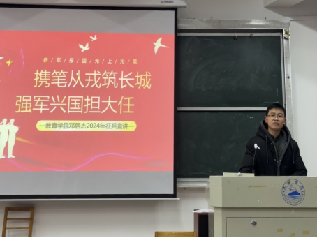 本次宣讲会由员工科邓居杰老师主持并主讲。宣讲会上,邓老师以中国的国际形势切入主题,围绕“政策新变化”、“入伍的优待政策”、“军旅生活”和“征兵入伍”四个部分进行征兵宣讲。会中,邓老师向大家强调了作为一名合格的征兵老员工需要满足什么条件,并为同学答疑解惑。他表示当兵固然艰苦,但有志青年应该树立远大志向,踊跃参军,到绿色军营中施展自己的才干,为实现强军梦、强国梦贡献自己的力量。