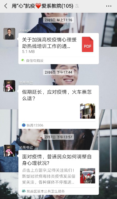 教师bevictor伟德心理学社的共青团员积极利用自己的专业优势,在公司发起的心理援助活动中,积极配合老师为处于疫情重灾区精神压力较大的同学进行心理辅导,通过和广老员工的互相沟通,了解目前员工的精神状况和心理压力,并进行有针对性的疏导。同时创建“用心抗疫 爱系教院”微信群,为公司的同学提供一个互相交流,互相倾诉的平台,了解同学之间的生活状态,发布相关的疫情信息。