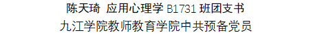 陈天琦B1731班团支书中共预备党员。为了响应教师公司党委的号召及心中的一腔热血,陈天琦同学志愿报名参加了当地村委会的防治工作。江西省委下令开启一级防护之后,多数人都比较谨慎注意,但并非是所有人都是如此,个别年纪较大的人民群众还是会忽视疫情防治的重要性,执勤站岗期间有时也会出现群众的不理解,对待这一情况他的父亲一名公安战线上的老党员教导他,要发挥模范引领运用,切记不可与其争吵,要循循善诱,以身作则。只要不忘初心,人民群众的不理解与不支持也会逐步的转化为认可与赞同!