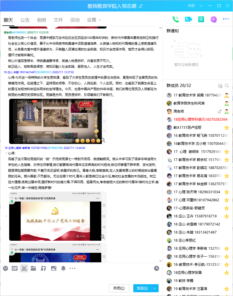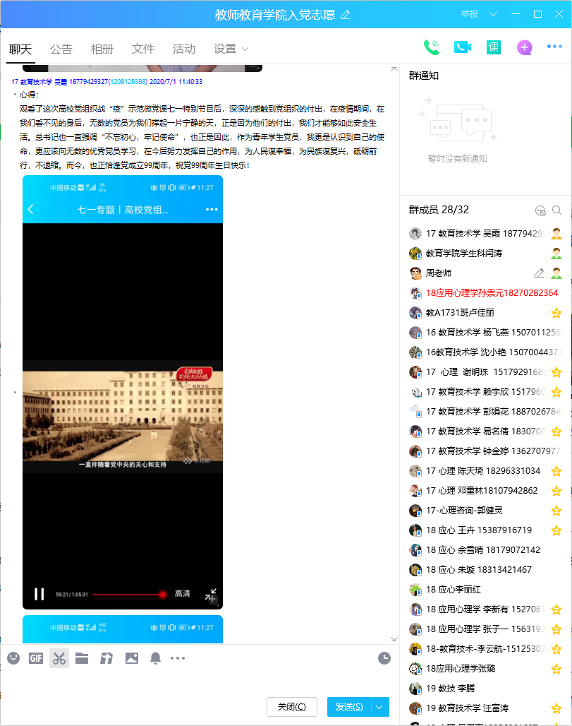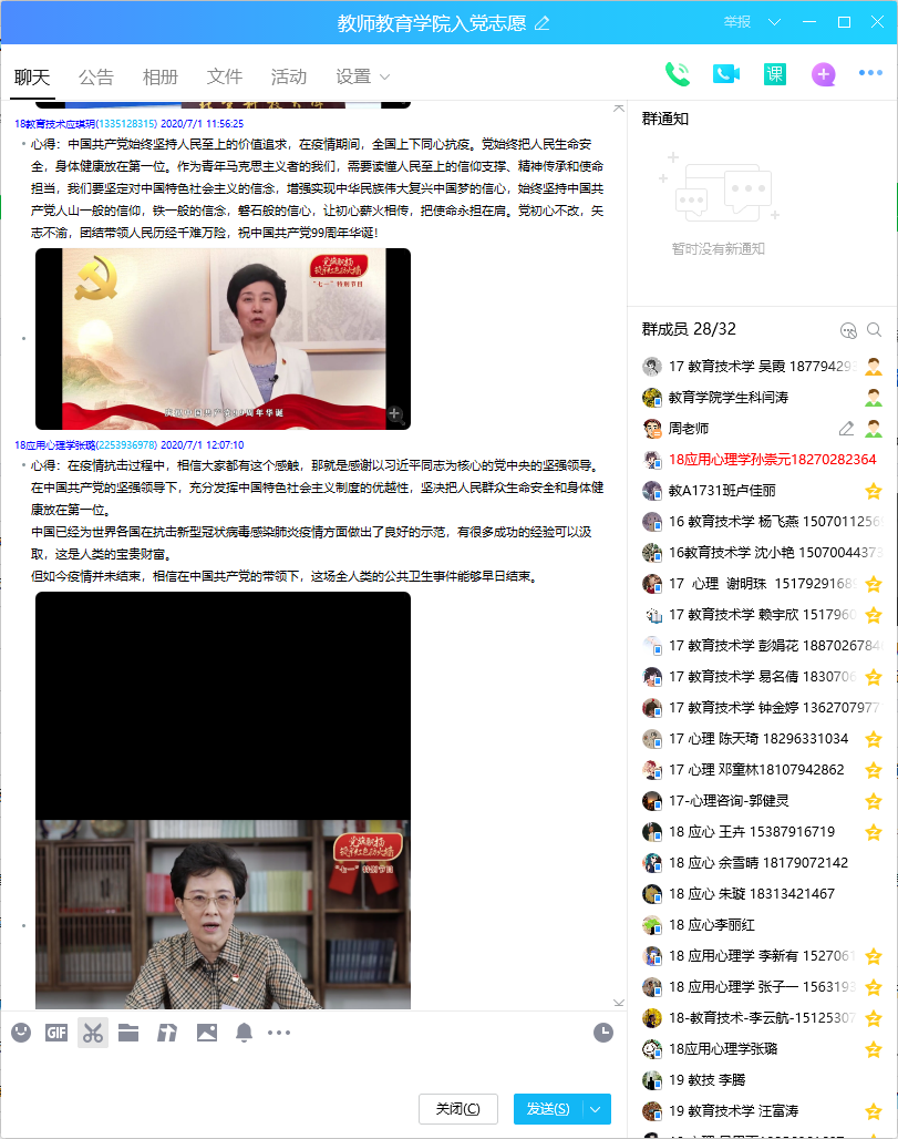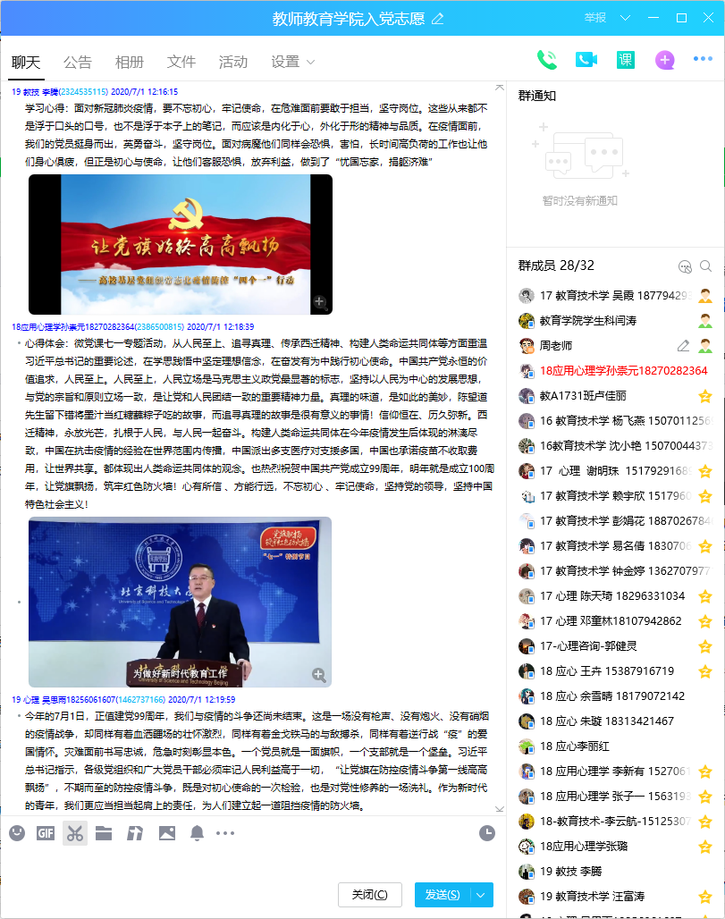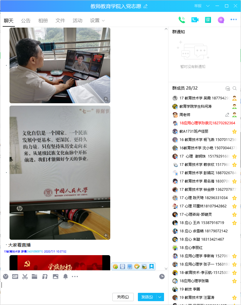 7月1日上午,在中国共产党成立九十九周年之际,教师bevictor伟德员工党支部组织入党积极分子同学集体网上收看战“疫”示范微党课——党旗飘扬,筑牢红色防火墙。通过学习中国人民大学、复旦大学、西安交通大学、北京科技大学四所教育部直属高校的党建特色和四个优秀基层党支部的先进事迹,大家谈体会,认识到党的永恒价值追求是“人民至上“”,党的伟大是因为植根于百姓的“人民的情怀”,大家纷纷表示要坚定理想信念,积极向组织靠拢,努力学习,展示入党积极分子的良好形象。