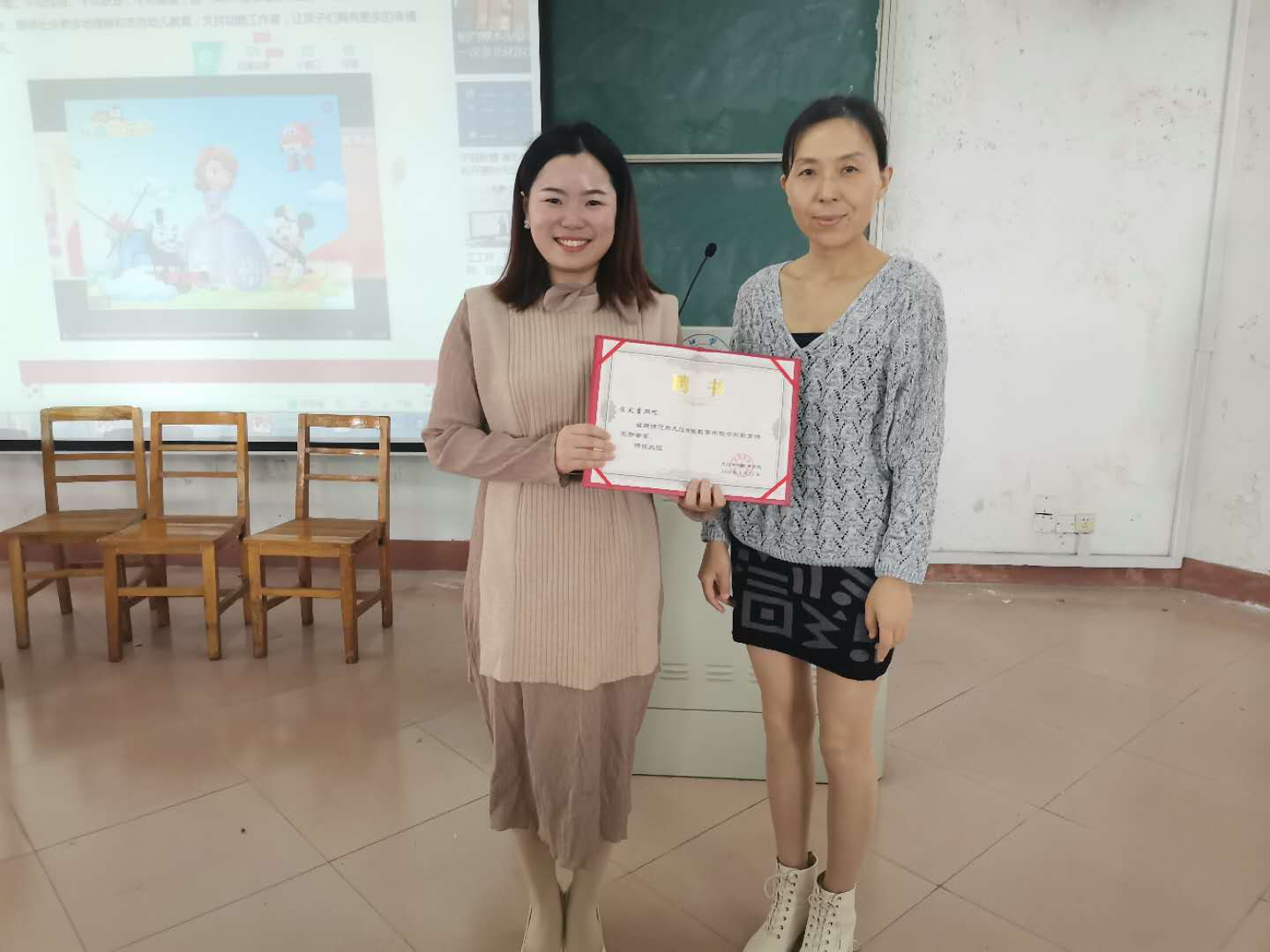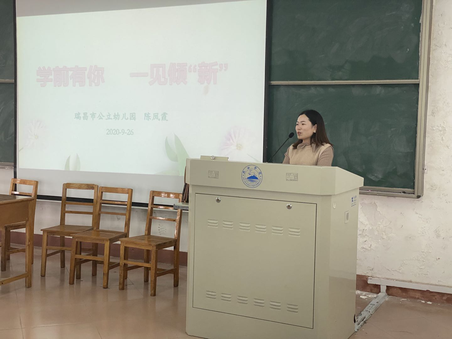 陈凤霞园长站在一个学前教育一线教师的角度,给同学们分享了学前教育教师的工作状态和职前准备工作。她以“有多少人主动选择学前教育专业”、“是否爱孩子”的提问开始,调动同学们注意力,继而分享了瑞昌市公立幼儿园前后变化发展的视频,以及幼儿园实际课程中的两个活动案例,向大家展示幼儿园教师真实的工作环境和工作基本内容。进而,她向同学们建议,为做好学前教师,要做好职业准备,尤其是要理论扎实、技能过硬,希望同学们在校努力学习,珍惜实践机会,不断提升自己,未来一定才能发展得越来越好。