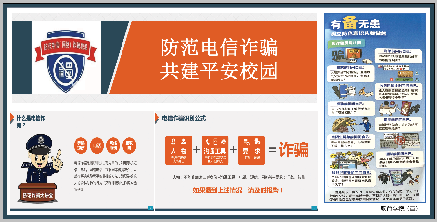 为响应建设平安校园的主题,并广泛宣传防电信诈骗,提高校园师生对电信诈骗手法的识别和防范能力,公司设计并制作了“防范电信诈骗,共建平安校园”为主体的宣传展板。展览的案例让同学们充分认识到电信诈骗的危害,也告诉同学们千万不要贪图小利,要多与家人朋友沟通核实,不要轻易上当。必要时应及时拨打110寻求帮助。