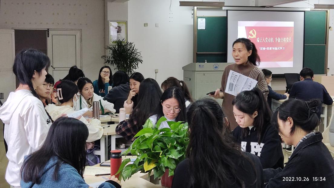 吴燕将心理学中的团辅理念巧妙地运用于党课教学中,她将全体学员分为8个互助式开放学习小组,通过小练习的方式请学员们深入思考“我的入党初心是什么?”“身边好党员中,谁对我的入党志愿影响最大?”“作为一名入党积极分子,我的提升空间有哪些?”等问题,小组学员就问题展开热烈讨论,在交流中碰撞思想,在沟通中凝聚共识。吴燕对学员们发言中的积极闪光点予以了充分的肯定,并结合大学学习生活实例引导学员们端正入党初心,树立正确的入党动机和理想信念。别样教学方式打开了入党积极分子们的心扉,让大家在严肃与活泼中感受到了党课深入人心的魅力。