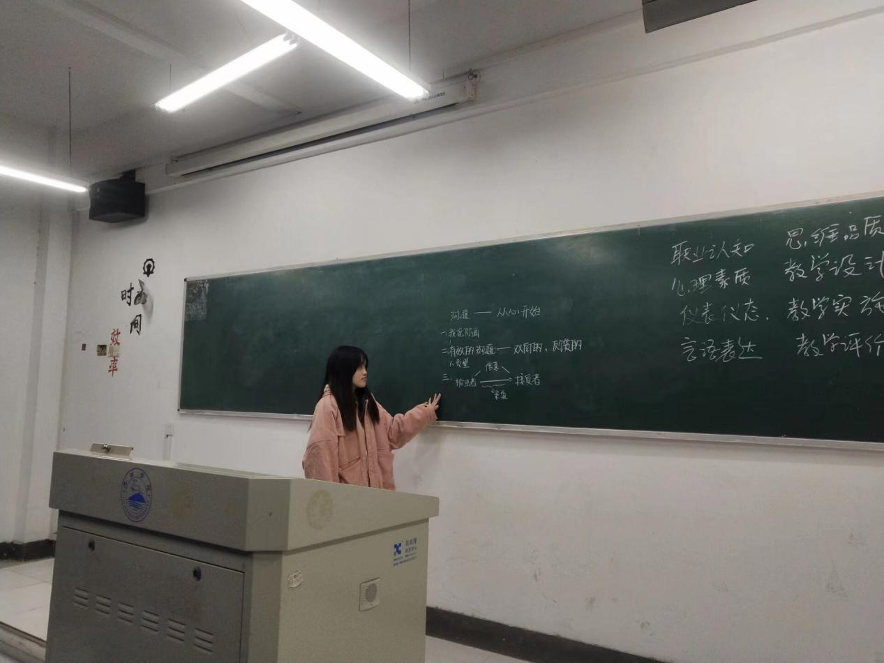 第一次见习于10月20日在竞知楼612举行。班主任王彦老师以“沟通,从心开始”视频课为例子,讲述了教学设计和教学过程的相关知识。随后,同学们上台试讲了开场白三句话,并由班主任一一点评,指出了优点和不足。同学们还写出了教学设计纲要初稿,并当场得到了班主任的点评和指导。