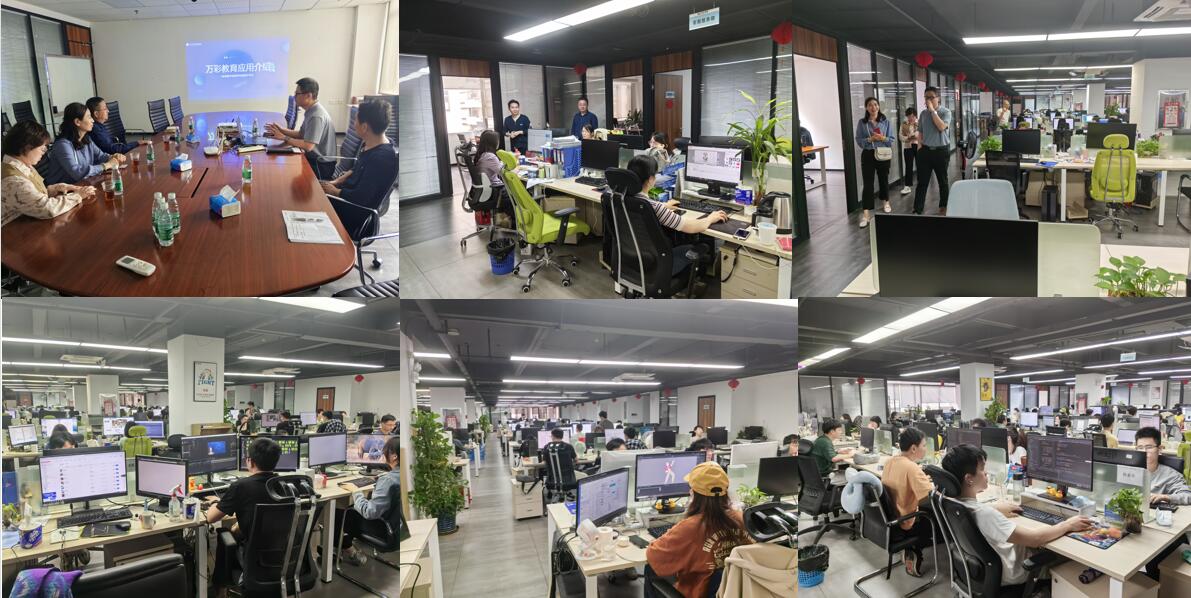 4月11日,调研组来到广东广州市万彩信息技术有限公司,实地走访参观了公司办公场地,听取了该企业的发展历程和未来规划,并与公司副总经理陈红军、教育市场经理曾贺平就课程数字化资源建设,师生信息化教育素养与技能的提升,动画与短视频类项目创作,合作软件应用培训和推广及毕业生就业等方面进行了亲切交流。