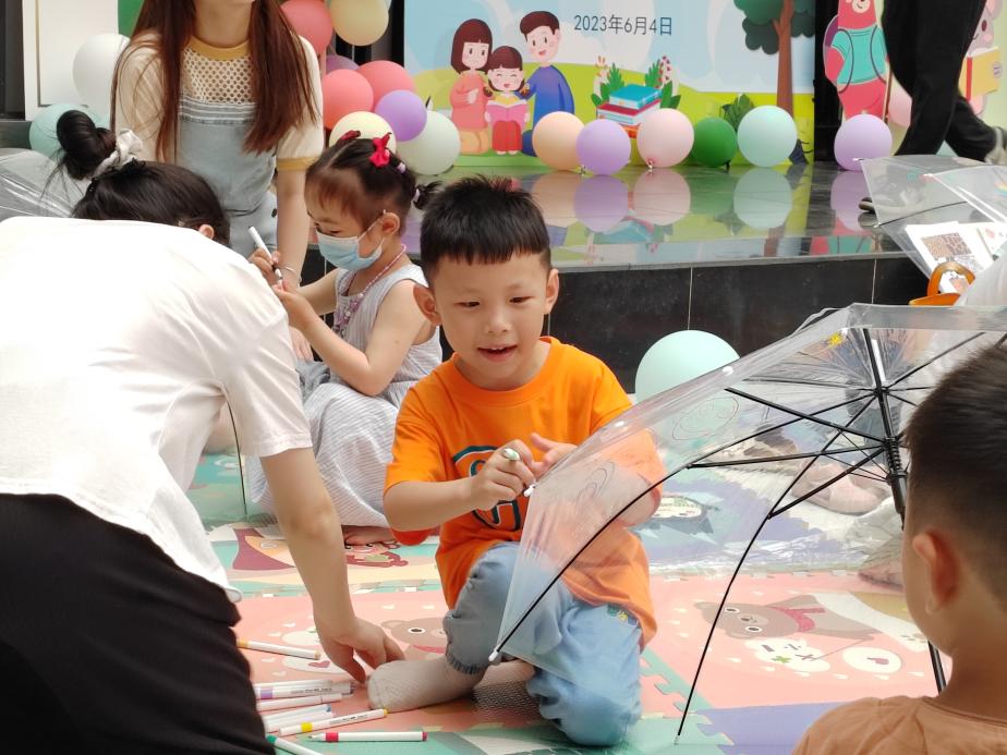 接下来,家庭成员共同参与了两组互动游戏。在第一组游戏“手工画伞”中,家长和孩子们共同在给定的透明伞上用画笔进行了艺术创作,孩子们积极发挥想象力,对这个活动展现出了极大的兴趣。