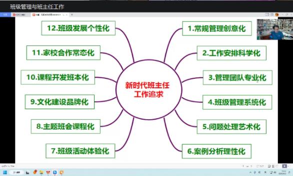 他结合大量教育案例,从“点”“线”“面”三个角度,以“点”带面,以“线”串点,以“面”聚魂,给授课老师和同学们传授了如何班级系统管理、班级常规管理、营造班级文化,内容具有极强的现实性、指导性、操作性。
