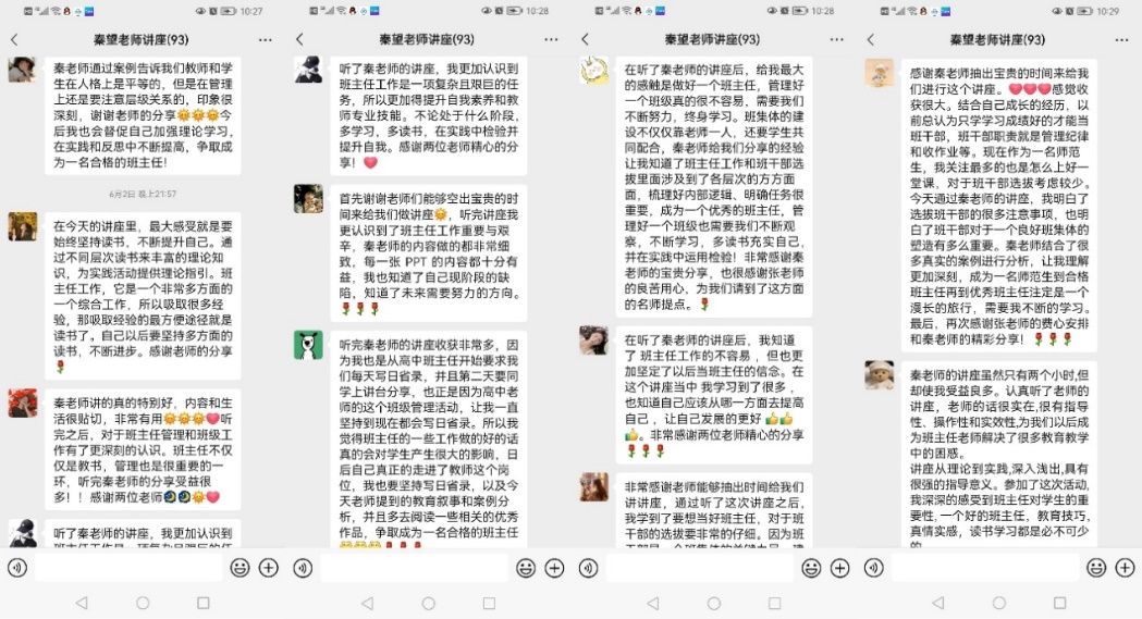 在2小时多的讲座过程中,一个个充满智慧的教育故事,一个个引人深思的教学案例,让与会的同学们深受启发,意犹未尽。同学们表示,秦老师的讲座不仅使我们懂得要爱教育、爱员工,更明白要如何爱、如何教、如何管,这对今后走上工作岗位有很大的帮助。