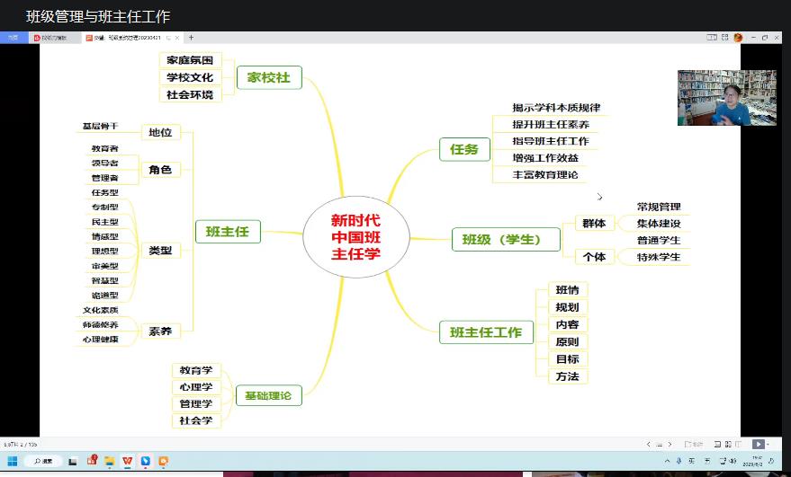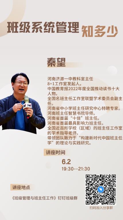《班级管理与班主任工作》课程是师范生从事教师职业和中小学班主任工作的核心职业课程,是师范生职前教育的必修,对帮助师范生掌握班主任工作的基本知识、原理和方法,提升班级管理、教育能力和科研能力,树立正确的员工观和教育观,形成愿做、能做、会做班主任工作的信念和素具有重要意义。6月2日晚上,应教育技术学专业张生花老师邀请,全国知名班主任、德育专家秦望老师在线给公司本学期开课班级做了题为“班级系统管理”的专题讲座,师生共计130余人参加学习。