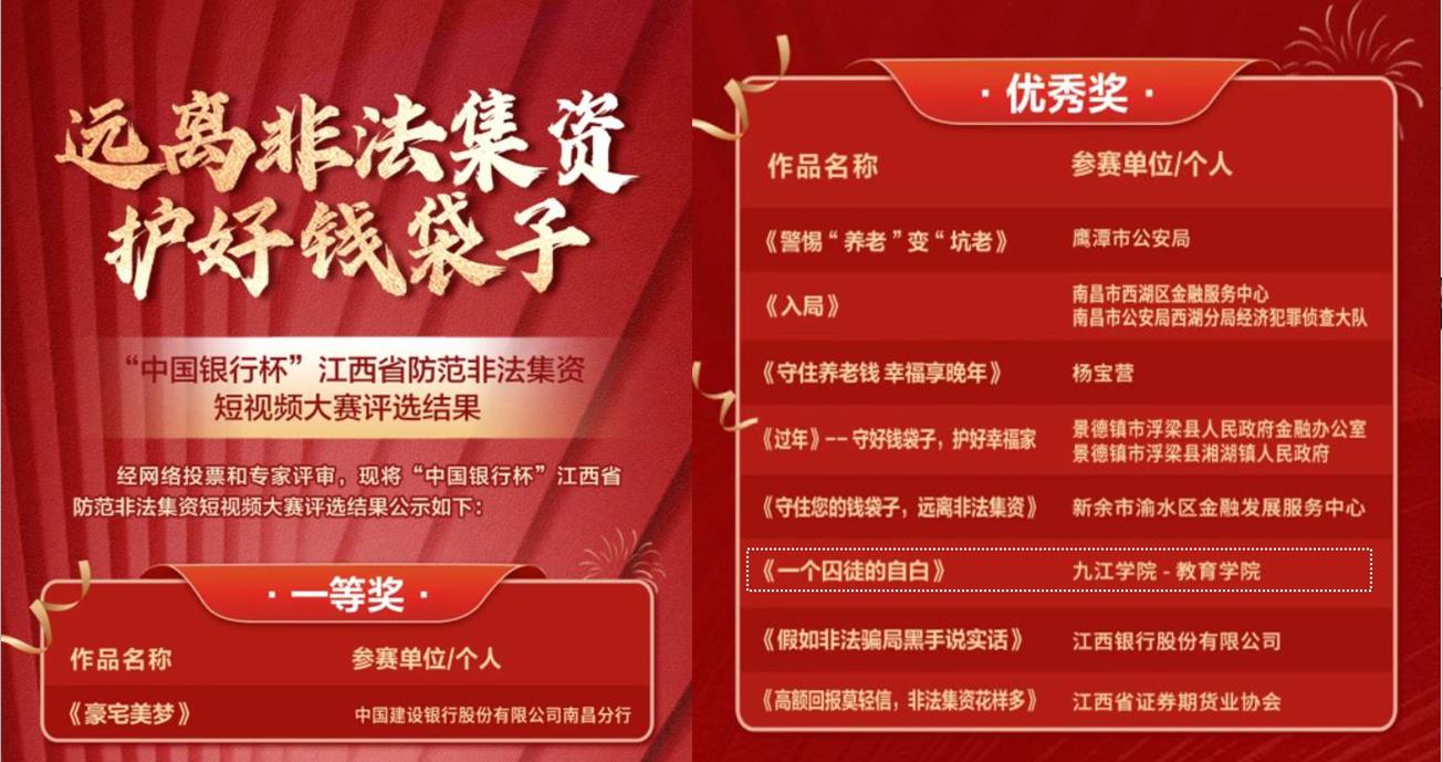 6月8日,“中国银行杯”江西省防范非法集资短视频大赛完美落下帷幕。经过作品征集后开始紧张激烈的角逐,公司投稿的原创短视频作品《一个囚徒的自白》通过了层层筛选入围全省50强后,随后又在终审比赛中获得了优秀奖的好成绩,这是公司首次获得此项赛事的省级奖励,也是全省最终获奖名单中唯一一个高校单位。