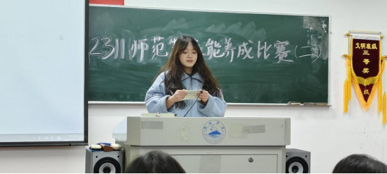 本次系列活动自新生入学以来已持续近五个月,分别在2023年11月19日、2023年12月17日、2024年4月8日连续举办了三次,活动设置了粉笔字书写及展示、随机命题抽取、PPT说课和C语言程序设计等多项相关的师范生技能比赛项目。比赛过程中,由班主任和部分高年级的同学作为评委进行评价与指导。活动开展不仅提升了同学们对该类技能的掌握能力,也丰富了同学们的业余生活。