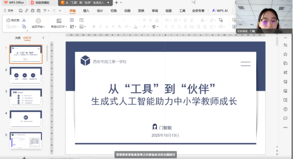 西安市曲江第一公司门敏敏老师以《从工具到伙伴:生成式人工智能助力中小学教师成长》为题,分享了她对教师与AI关系的深刻洞见。她提出,AI应从辅助教学的“工具”升级为协同育人的“伙伴”,并结合一线教学案例,生动展示了“教师—AI”协作共生如何切实推动课堂教学的蜕变,为一线教师指明了融入人工智能时代的实践路径。