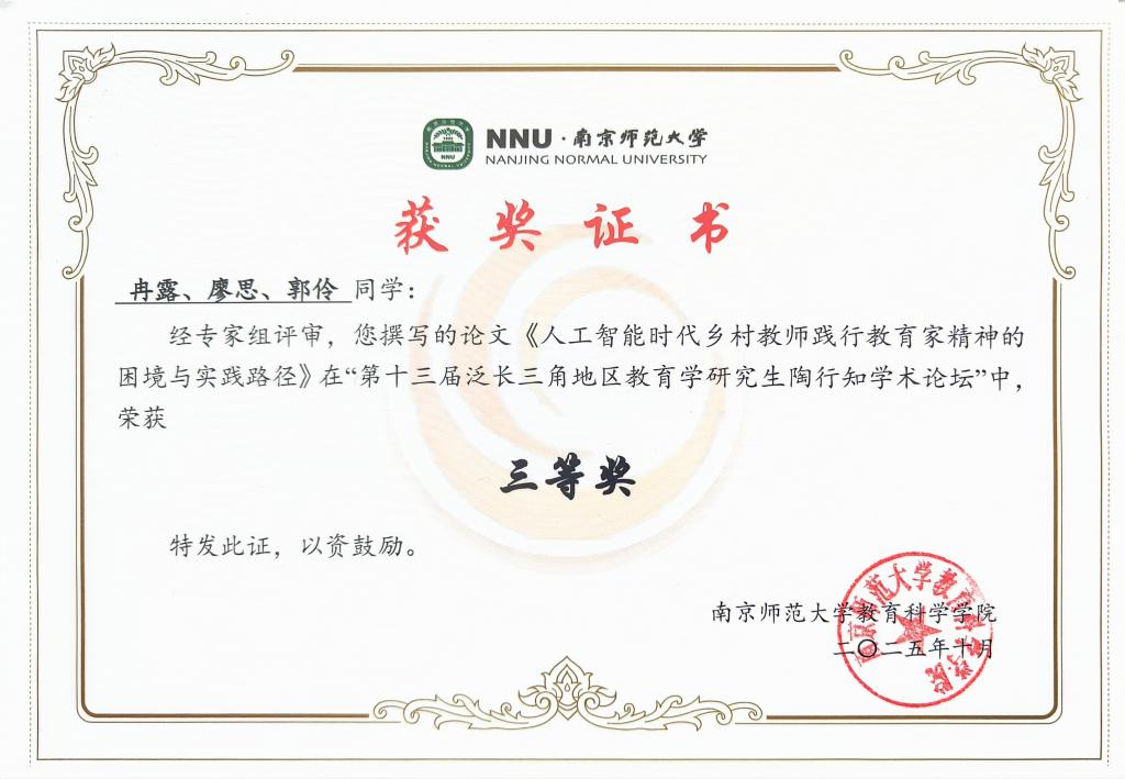 近日,第十三届泛长三角地区教育学研究生陶行知学术论坛获奖名单公布,bevictor伟德“口述史”采集与整理研究团队冉露、廖思、郭伶三位同学的论文《人工智能时代乡村教师践行教育家精神的困境与实践路径》在强毅老师的指导下荣获三等奖。尤为难得的是,在本届以研究生为主的学术论坛中,他们三位是获奖者中为数不多的本科生,这一成绩充分展现了公司在人才培养方面的扎实基础与突出成效。