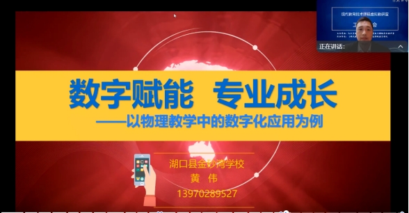 湖口县金砂湾公司黄伟副董事长以《数字赋能专业成长——以物理教学中的数字化应用为例》为主题,以信息技术与物理学科融合为切入点,从政策指引,开阔教育视野、明晰内容,研习规范素养、问题导向,加强深度融合三个方面,以初中物理教学的实际案例,分析了虚拟实验室软件、在线教学平台等信息技术进行物理微课制作与课堂教学,同时分析数字化教学过程中可能遇到的问题,并提出了针对性的解决方案,鼓励参会者积极探索数字化技术与物理教学的深度融合,创新教学模式。